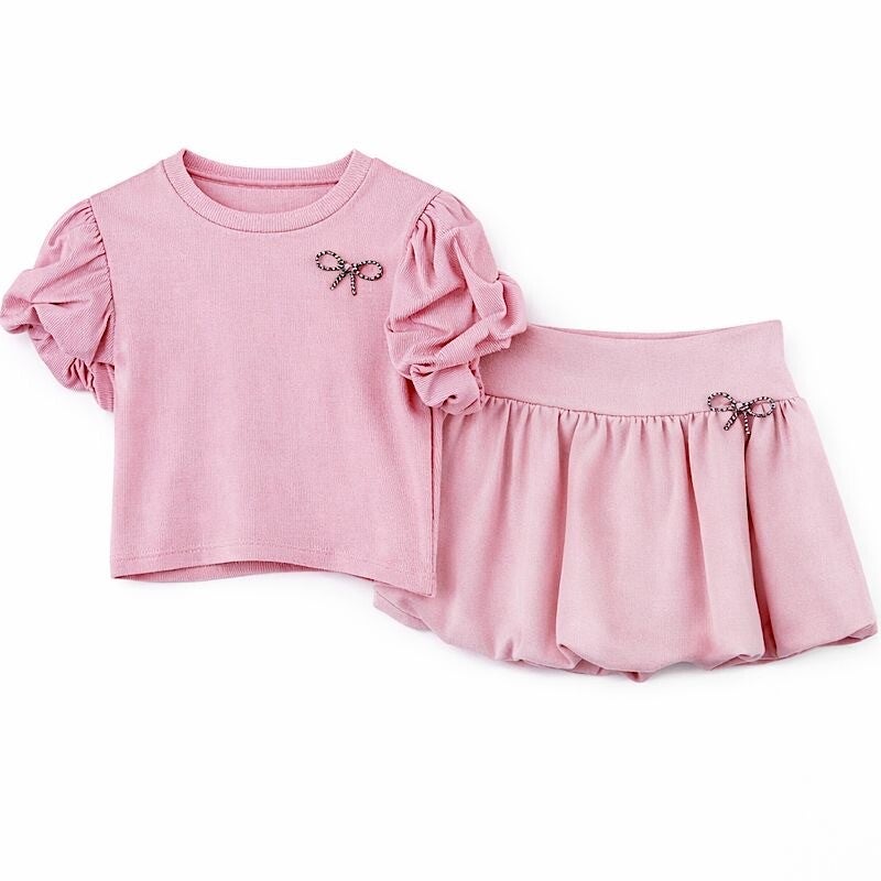 Kids Girls Pink Bow Frill 2pc Skirt Set