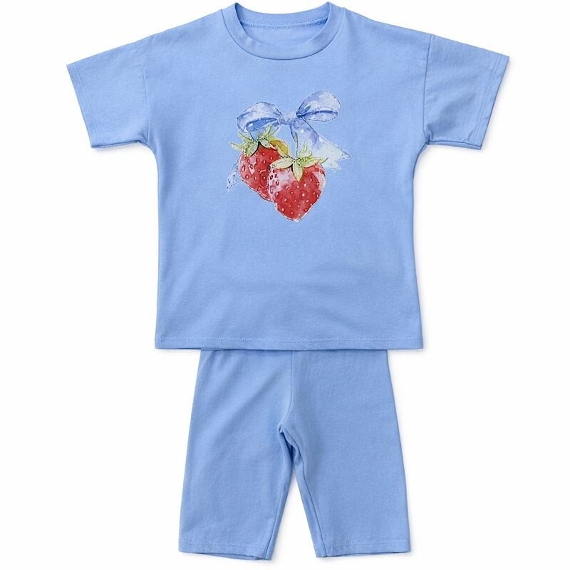Girls plain blue 2pc Set with short sleeve double strawberry bow print t-shirt and co-ord matching shorts set.