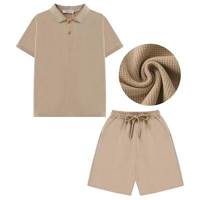 premium collection two-piece set featuring a breathable beige short-sleeve polo shirt paired with matching drawstring shorts. Crafted from soft, textured fabric for all-day comfort, this set is perfect for casual outings, playtime, or relaxed summer wear.