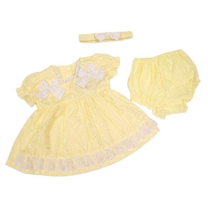 A sweet three-piece set featuring a soft yellow embroidered dress with delicate lace trim and bow details, matching bloomers, and a coordinating headband. Perfect for special occasions, photos, and sunny-day outings.