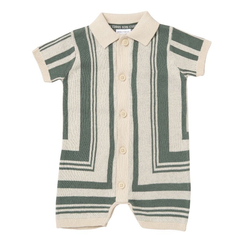 Soft cream knit romper with stylish green stripe pattern, button-down front, and a classic collar. Comfortable and breathable for everyday wear.